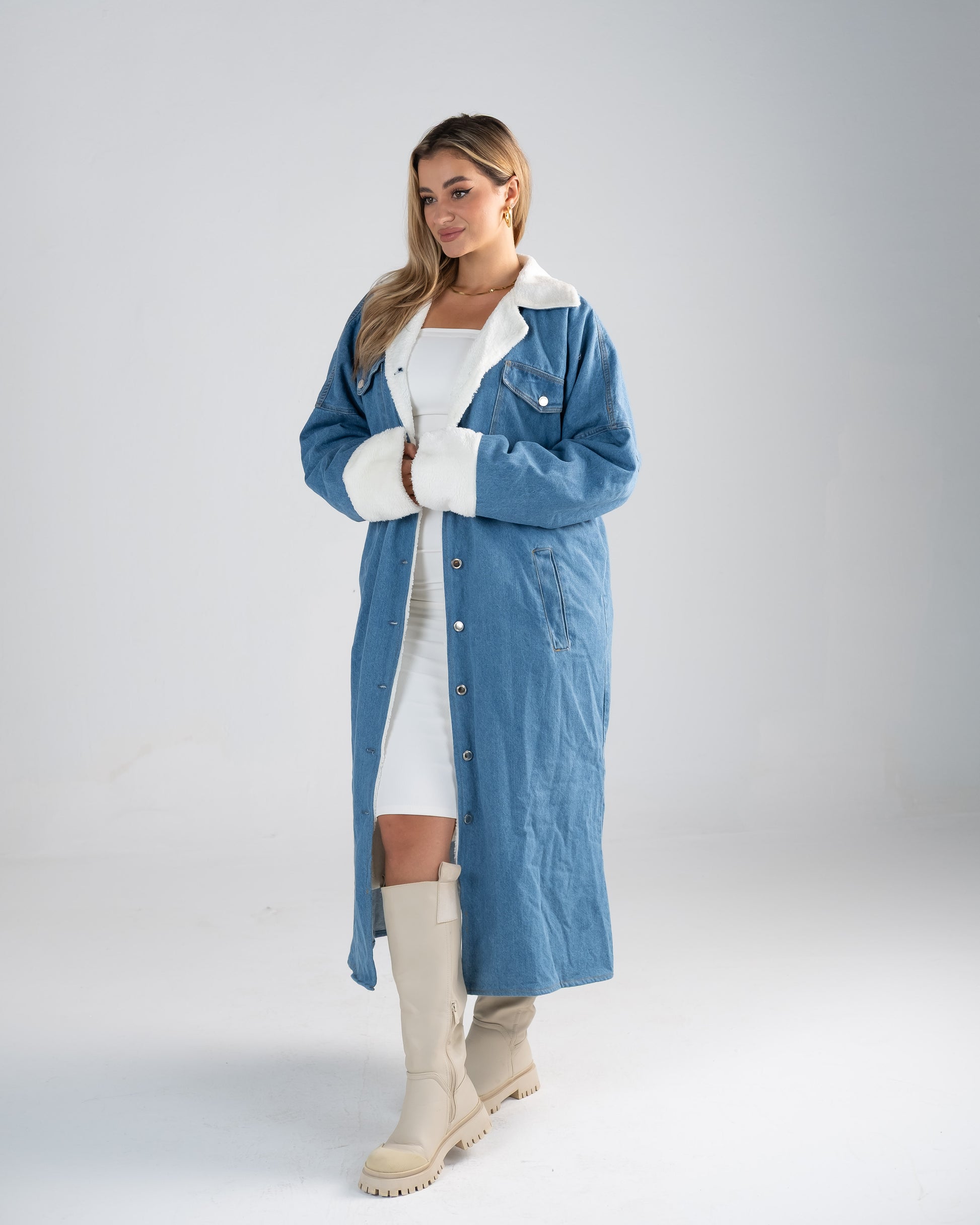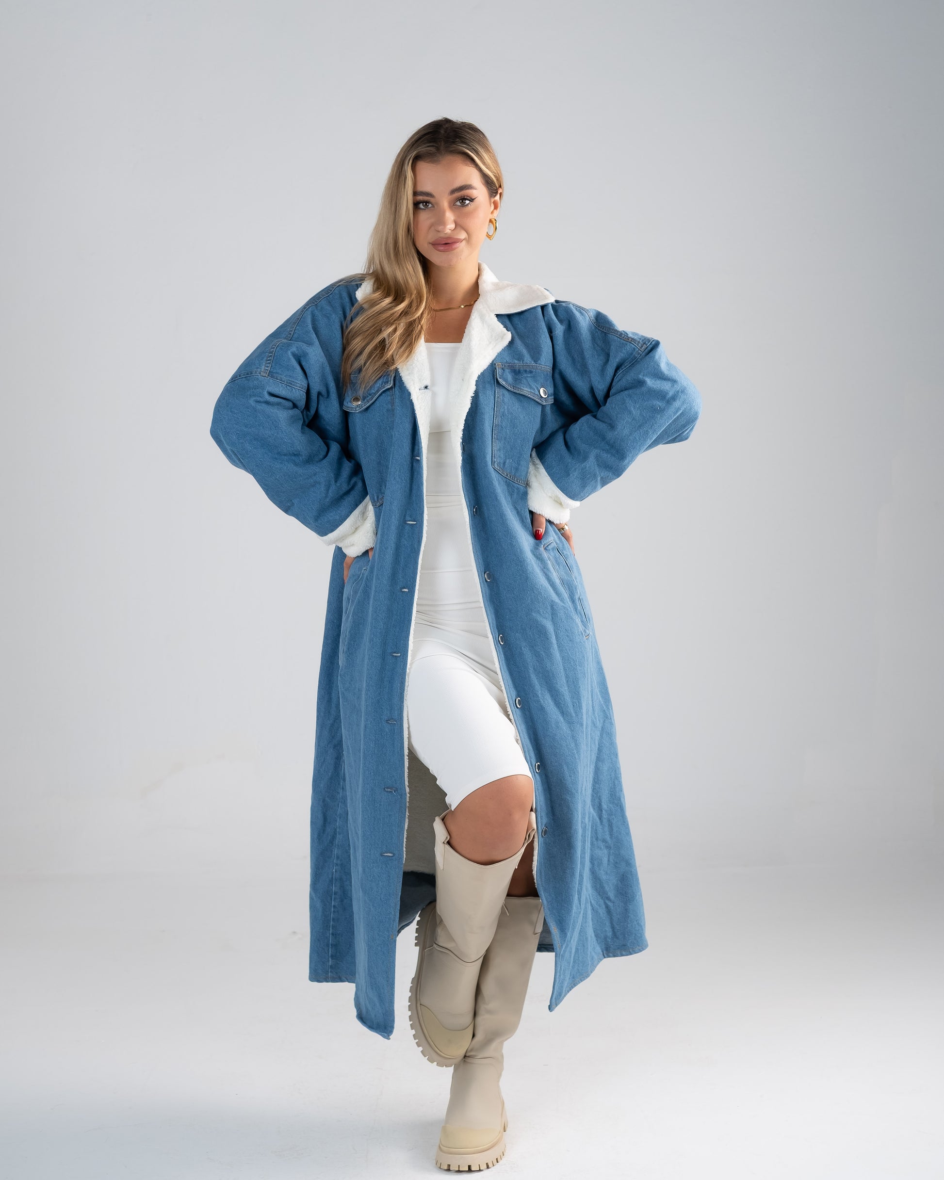 Imported sushi-wash denim jacket, fully lined with soft fur for extra warmth and style.”